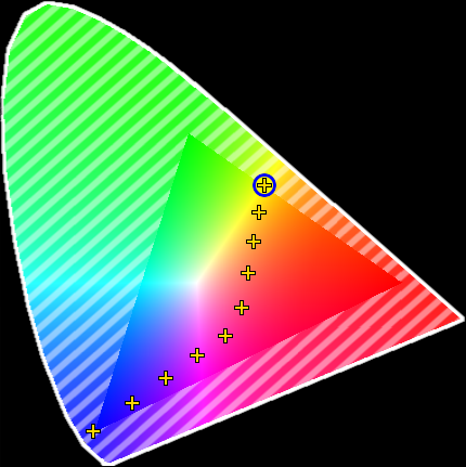 A path needs to be defined to control a color range from blue to yellow. The wish is to have the range go through the red area in a CIE color picker - instead of going through white. Three fixtures are needed to define the range.