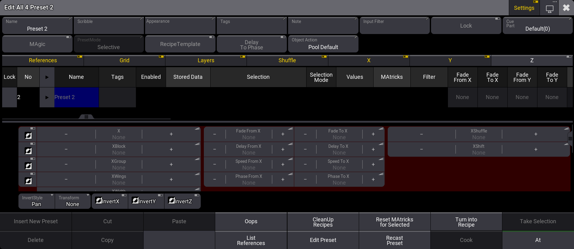 Recipe presets with no selection stored will call values with preset links into the programmer when a preset is defined in the preset instead of storing values in the recipe.