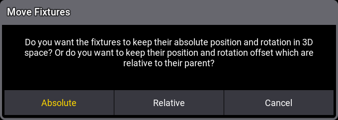 At the moment, all the fixtures are at the zero position in the 3D virtual space. So, it does not matter whether you select 'Absolute' or 'Relative'. But select one of them.