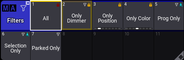 The selected filter usually has a yellow frame around it. A filter can also be called using the Call keyword. A called filter will have a yellow pulsating frame.