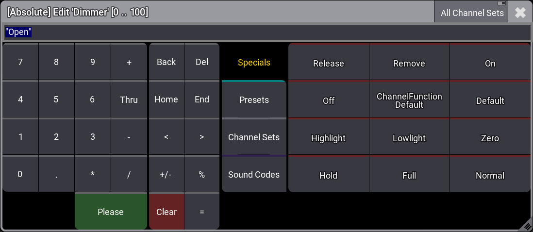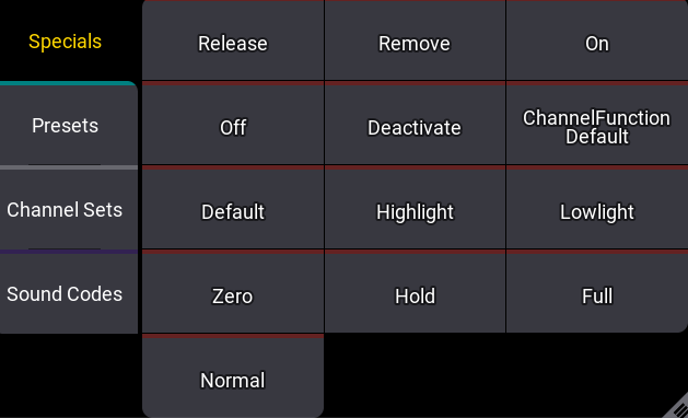 - ChannelFunctionDefault: Tap to set the attribute to the default value of the selected channel function. For more information see ChannelFunctionDefault Keyword.