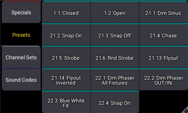 - Lowlight: Tap to load the lowlight value of the selected fixture into the programmer. For more information see the Lowlight Keyword.