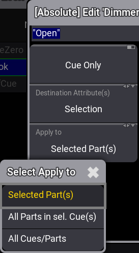 - All Fixtures: Edits will only apply to all attributes of all fixtures within the cue part.