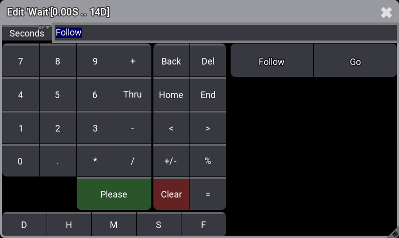 | Input from a standard keyboard, whether integrated under the console armrest or connected via USB, also populates the input field of the calculator. With one exception, keyboard shortcuts are disabled when entering text into a calculator. The exception is that T will enter the Thru keyword. |