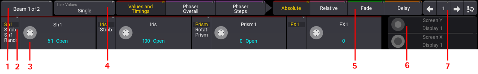 Step bar: The left and right arrows allow navigation between phaser steps in the programmer. The step number button displays the current phaser step in the programmer. Tap the step number button to open a calculator to choose a specific step. Tap the button to the right (